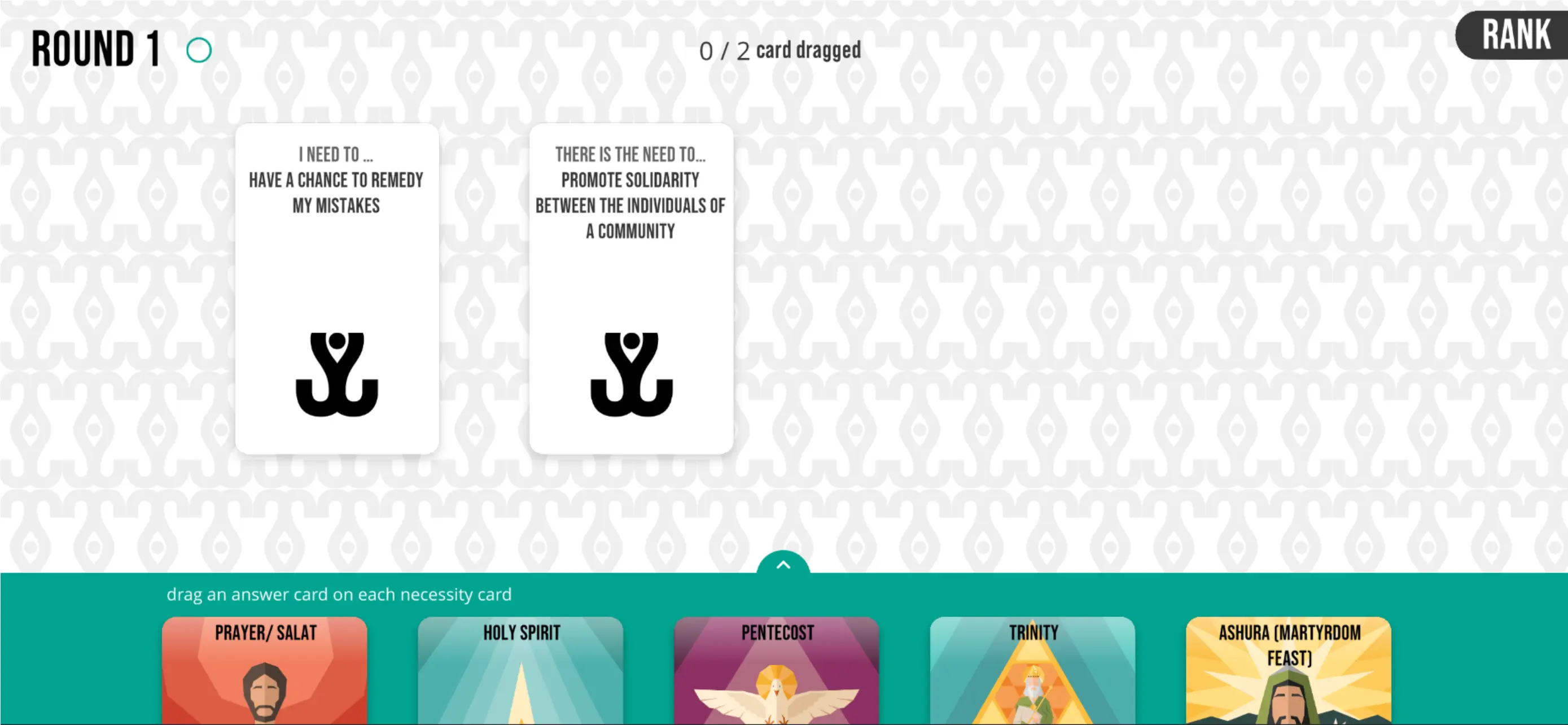40 Answers is a didactic game aimed at teaching that all religions, although different from each other, share the common function of giving answers to the basic questions and needs of the individual and the community.